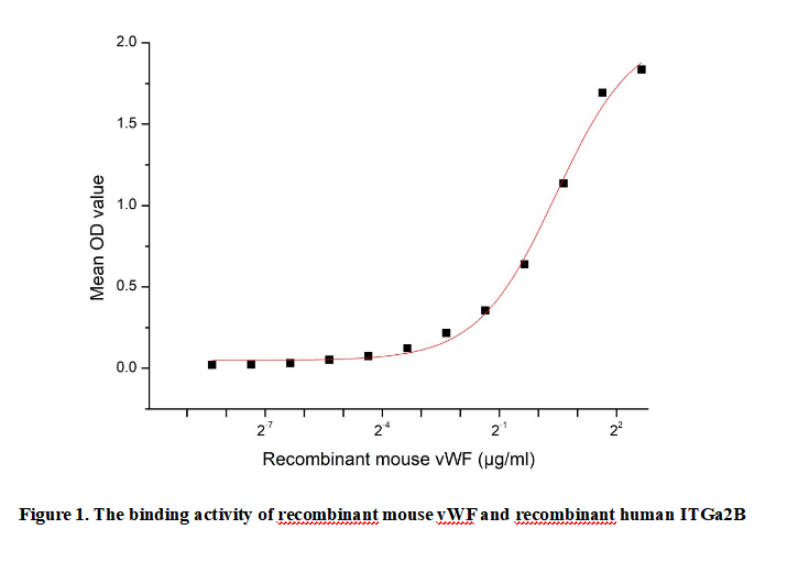Von Willebrand Factor (vWF) , a large multimeric plasma glycoprotein , is synthesized mainly by endothelial cells and megakaryocytes. The protein consists of multiple subunits, forming high - molecular - weight multimers. These multimers have emerged as a key player in both primary and secondary hemostasis.Besides,Von Willebrand Factor (vWF) specifically interacts with the Integrin Alpha 2B (ITGa2B) of the platelet membrane receptor complex, forming a critical molecular interaction that facilitates platelet aggregation and subsequent thrombus formation, thus a functional binding ELISA assay was conducted to detect the interaction of recombinant mouse vWF and recombinant human ITGa2B . Briefly, biotin-linked vWF were diluted serially in PBS, with 0.01% BSA (pH 7.4). Duplicate samples of 100μl were then transferred to ITGa2B-coated microtiter wells and incubated for 1h at 37℃. Wells were washed with PBST 3 times and incubation with Streptavidin-HRP for 30min, then wells were aspirated and washed 5 times. With the addition of substrate solution, wells were incubated 15-25 minutes at 37℃. Finally, add 50μl stop solution to the wells and read at 450nm immediately. The binding activity of vWF and ITGa2B was shown in Figure 1, the EC50?for this effect is 1.36μg/mL.
