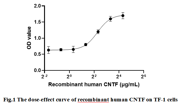 Ciliary Neurotrophic Factor (CNTF) is a multifunctional cytokine primarily known for neurotrophic roles. It supports survival and differentiation of ciliary ganglion neurons and other neuronal populations. Beyond neurotrophy, it aids neuroprotection by inhibiting neuronal apoptosis, promoting axonal regeneration, and modulating neuroinflammation, showing potential in treating neurodegenerative disorders.?To test the effect of CNTF on cell proliferation, TF-1 cells were seeded into triplicate wells of 96-well plates and allowed to attach, replaced with various concentrations of recombinant human CNTF. After incubated for 72h, cells were observed by inverted microscope and cell proliferation was measured by Cell Counting Kit-8 (CCK-8). Briefly, 10 μl of CCK-8 solution was added to each well of the plate, then the absorbance at 450 nm was measured using a microplate reader after incubating the plate for 1-4 hours at 37 ℃. Cell viability was assessed by CCK-8 assay after incubation with recombinant human CNTF for 72h. The result was shown in Figure 1. It was obvious that CNTF significantly increased cell viability of TF-1 cells. The ED50 of recombinant human CNTF is 4.82 μg/ml.