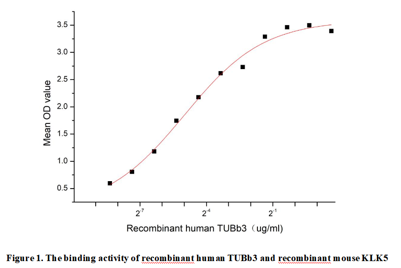 Tubulin Beta 3 (TUBb3) is a primarily neuron-expressed β-tubulin isotype critical for microtubule dynamics, axonal guidance, and neurodevelopment. As a key cytoskeletal component, it maintains neuronal structural integrity and intracellular transport, serving as a differentiation marker. Aberrant TUBB3 expression correlates with neurological disorders and chemoresistance. Its interaction with kallikrein-related peptidase 5 (KLK5) may modulate KLK5's proteolytic activity in pathological contexts such as tumor metastasis or neural plasticity.Thus a functional ELISA assay was conducted to detect the interaction of recombinant human TUBb3 and recombinant mouse KLK5. Briefly, TUBb3 was diluted serially in PBS with 0.01% BSA (pH 7.4). Duplicate samples of 100 μl were then transferred to KLK5-coated microtiter wells and incubated for 1h at 37℃. Wells were washed with PBST and incubated for 1h with anti-TUBb3 pAb, then aspirated and washed 3 times. After incubation with HRP labelled secondary antibody for 1h at 37℃, wells were aspirated and washed 5 times. With the addition of substrate solution, wells were incubated 15-25 minutes at 37℃. Finally, add 50 μL stop solution to the wells and read at 450/630nm immediately. The binding activity of recombinant human TUBb3 and recombinant mouse KLK5 was shown in Figure 1, the EC50?for this effect is 0.03 μg/mL.